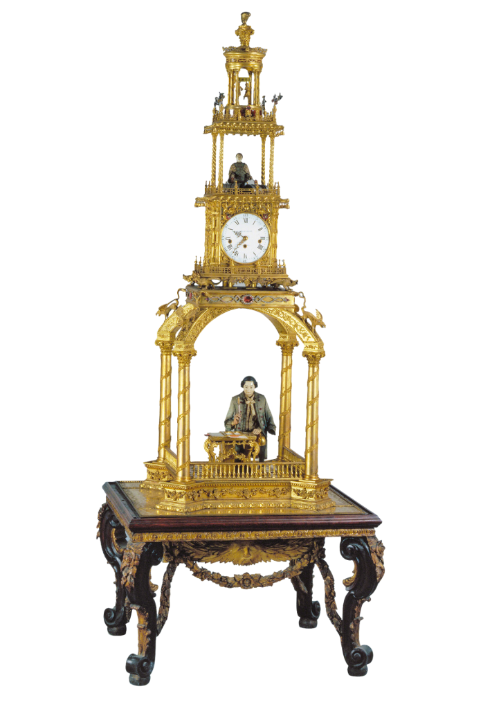 ——นาฬิกาที่มีชื่อเสียงที่สุดในบรรดานาฬิกาสะสมในราชสำนักชิงคือนาฬิกาที่มีชื่อว่า “นาฬิกาคนเขียนหนังสือ” นาฬิกาเรือนนี้เป็นนาฬิกาทรงหอคอยแบบตะวันตกสูงสี่ชั้น ความสูง 2.31 เมตร ชั้นบนสุดเป็นหอระฆัง ชั้นสองเป็นตุ๊กตาคนตีกลองแต่งกายอย่างจีน ชั้นสามเป็นหน้าปัดบอกเวลา และชั้นล่างสุดมีตุ๊กตาแต่งตัวอย่างชายตะวันตกในคริสต์ศตวรรษที่ 18 นั่งอยู่ที่โต๊ะเขียนหนังสือ เมื่อถึงเวลาที่เข็มสั้นชี้บอกชั่วโมงที่ 3, 6, 9 และ 12 นาฬิกา ระฆังชั้นบนจะดังขึ้น ก่อนที่ตุ๊กตาคนตีกลองจะลั่นกลอง และตุ๊กตาชายเขียนหนังสือจะเริ่มลงมือใช้พู่กันที่บรรจุหมึกไว้ภายในเขียนตัวอักษรแปดตัวลงบนกระดาษเป็นคำว่า 八方向化,九土來王” (ทั่วแดนน้อมรับอารยธรรม ทั่วหล้าต่างมาสวามิภักดิ์) อันมีนัยในการสรรเสริญพระบารมีของจักรพรรดิและความยิ่งใหญ่ของจักรวรรดิจีน นาฬิกาเรือนนี้เป็นผลงานการออกแบบและจัดสร้างโดยช่างนาฬิกาตระกูลฌาเกต์–โดรซ์ (Jacquet–Droz Family) แห่งสวิตเซอร์แลนด์ ก่อนจะนำมาทูลเกล้าฯ ถวายจักรพรรดิเฉียนหลง ความมหัศจรรย์ในกลไกของนาฬิกาเรือนนี้เป็นเหตุให้จักรพรรดิเฉียนหลงทรงโปรดนาฬิกาใหญ่เรือนนี้มาก และเป็นต้นแห่งความเจริญของตระกูลฌาเกต์–โดรซ์ เพราะราชสำนักชิงได้กลายเป็นลูกค้ารายใหญ่ของตระกูลนี้ต่อไปอีกหลายทศวรรษ